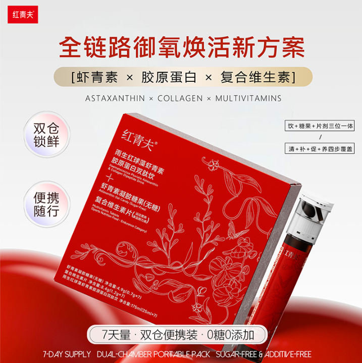 配料表:雨生红球藻虾青素胶原蛋白双肽饮25ml×7支:纯化水、鱼胶原蛋白肽(添加量8000mg/瓶)、鲣鱼弹性蛋白肽、葡萄粉、透明质酸钠、雨生红球藻虾青素微囊粉(添加量1mg/瓶);虾青素凝胶糖果(无糖)0.7g×7粒:亚麻籽油、10mg雨生红球藻油(虾青素油);复合维生素片1.2g×7片:维生素C、维生素A、维生素B1、维生素B2、烟酸、泛酸、维生素B6、生物素、叶酸、维生素B12、维生素D、维生素E
