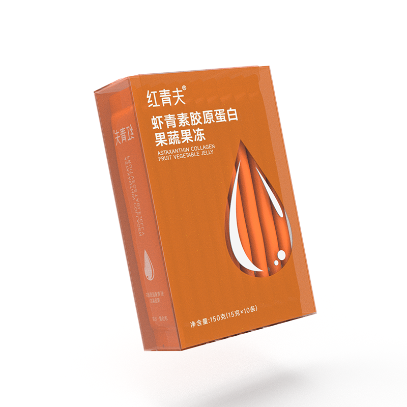 配料表:纯净水、低聚果糖、浓缩苹果汁、复合果蔬粉(苹果、香蕉、香橙、水蜜桃、西兰花、菠菜、芹菜)、浓缩蓝莓汁、鱼胶原蛋白肽粉、菊粉、复配果冻凝固剂(刺槐豆胶粉、卡拉胶、魔芋粉)、柠檬酸、雨生红球藻粉(虾青素含量>75%)、山梨酸钾、柠檬酸钠